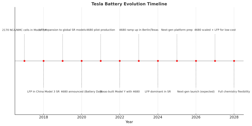 Here is the visual timeline chart showing Tesla’s battery evolution by year, chemistry, and key deployment milestones.