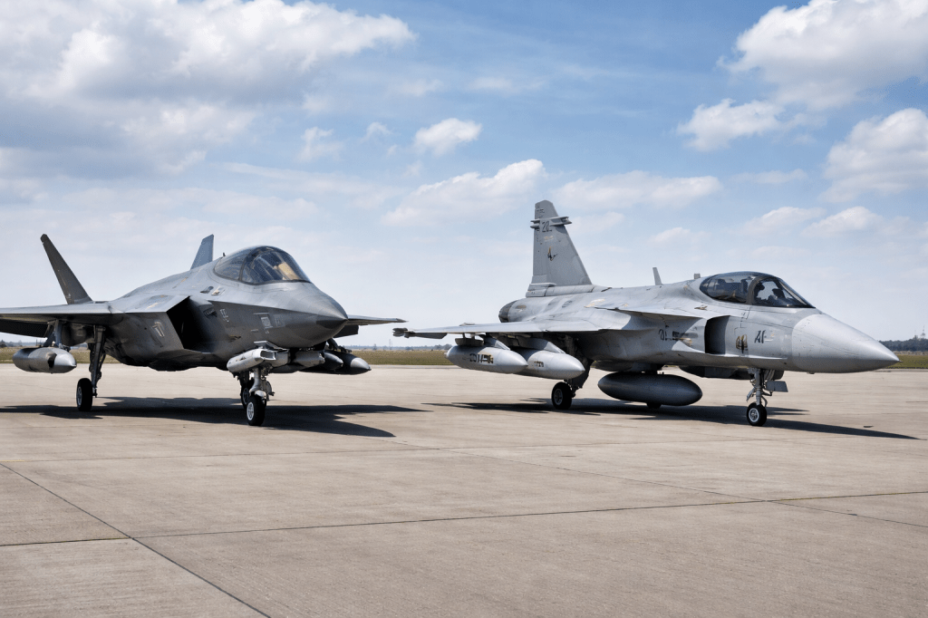 Right = Gripen (agile, endurance-oriented, sovereign-configurable fighter)