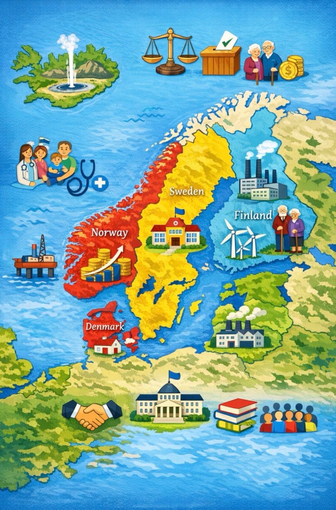 Welfare state: a system in which the state guarantees social protection and basic well-being as a right.
